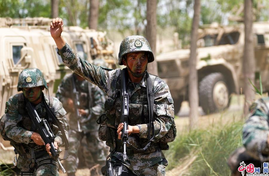 第76集团军某特战旅营长刘近(中)带领特战小队进行突击清剿行动。张永进 摄